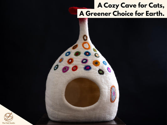 Handmade Felt Cat Cave Bed – Beige Floral Wool Pet House (Ships USA)